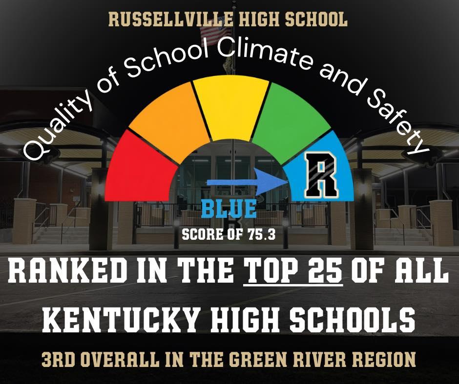Russellville High School has been ranked in the Top 25 of all Kentucky high schools for School Climate & Safety. RHS ranked number third out of 50+ high schools in the entire Green River Region. Principal Drew Teel says: “This accomplishment is all due to our incredible students, dedicated staff, and the Panther pride that fills these halls every single day. Thank you for making RHS not just a school, but a home.”