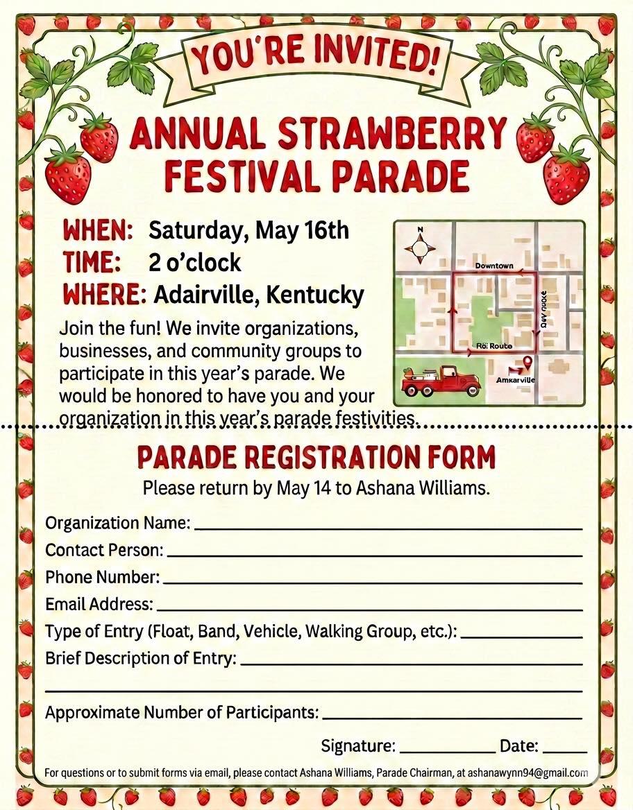 Organizations, businesses and community groups who would like to participate in the Adairville Strawberry Festival Parade on Saturday, May 16, are invited to submit a registration form. . If you are interested in participating, please reach out to Parade Chair Ashana Williams by May 14 for registration details and event guidelines. Her email address is at the bottom of the accompanying graphic.