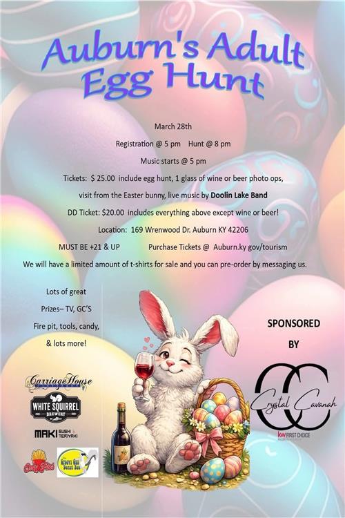 The popular annual Adult Egg Hunt will be held again in Auburn this Saturday, beginning at 5 p.m. at 169 Wrenwood Drive. A $25 ticket includes the egg hunt, one glass of wine or beer, a visit with the Easter bunny, and live music by Doolin Lake Band. Lots of nice prizes will be handed out. A ticket is $25 per person except for those who don’t want the beverage can pay $20. Anyone attending must be $25 or older.