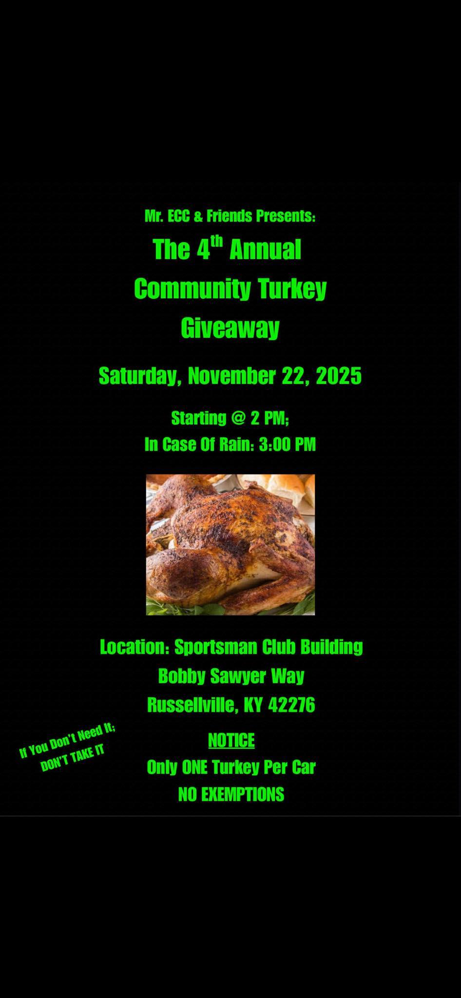 For the fourth straight year, ECC Pressure Washing is leading an effort to give turkeys for Thanksgiving to families in need. Led by owner Marcel Edwards, some 250 turkeys will be available for pickup Saturday at the Sportsman Club at City-County Park in Russellville. Edwards says, “Every job I put back for this.” He also notes others have donated to this. The giveaway, which stipulates only one turkey per car, will start at 2 p.m. unless it is raining. If it is, the disbursement will begin at 3.