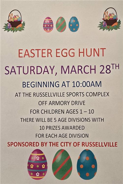 The annual Easter Egg Hunt conducted by the City of Russellville will be held this Saturday, beginning at 10 a.m. at the Russellville Sports Complex off Armory Drive for ages 1-10. Participants will be divided into five age groups with 10 prizes awarded in each division.