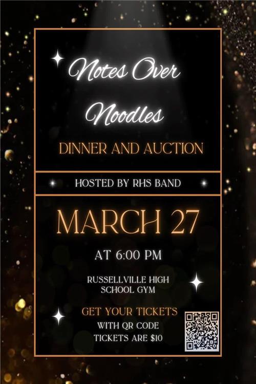 The Russellville High School Band will dish out pasta and fun music during the annual Notes Over Noodles dinner and auction. The event, which was first held in 2018, begins at 6 p.m. in Jim Young Gymnasium. Tickets, which cost $10, can be reserved by scanning the QR Code on the accompanying graphic.