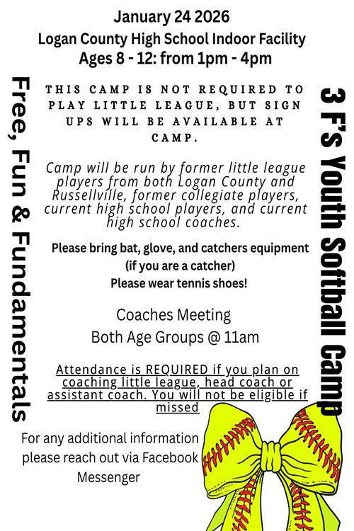 From Logan County Little League Baseball and Softball: With the snow that’s being predicted, we have decided to move the 3 F’s camp from this Saturday (Jan. 24) to Feb. 7. Times will be the exact same, just on a different day now due to weather. Everyone have a fun and safe weekend!