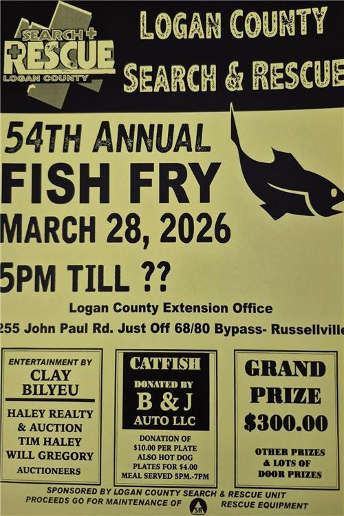 The annual Logan County Search & Rescue Fish Fry will be held Saturday, March 28, beginning at 5 p.m. at the Logan County Extension Office. A catfish meal—furnished by B&J Auto of Auburn as always—will cost $10 or a hot dog meal for $4 will be available. Haley Realty & Auction will conduct an auction of donated items with Tim Haley and Will Gregory on the speaker. Funds raised will be used for maintenance of Search & Rescue equipment.