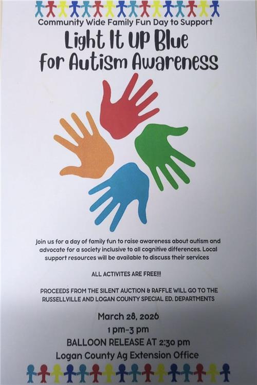 The annual Light It Up for Autism Awareness event will be held Saturday from 1-3 p.m. at the UK Ag Complex/Logan County Extension Office. Several activities will be available, including a balloon launch at 2:30 p.m. Proceeds from a silent auction and raffle will go to the Russellville and Logan County special education departments.