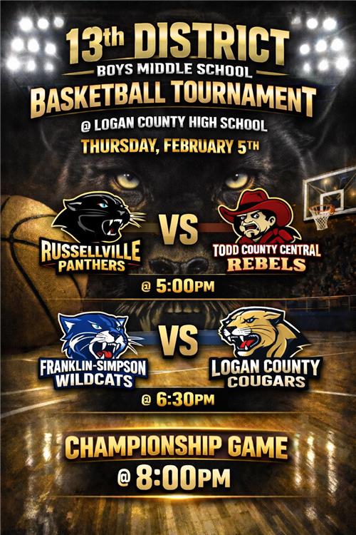 The 13th District Middle School Boys Basketball Tournament will be played tonight at Logan County High School. Russellville will play Todd County at 5 p.m. The Franklin-Simpson vs. Logan County game will tip off at an estimated 6:30. The winners will meet at 8 for the championship.