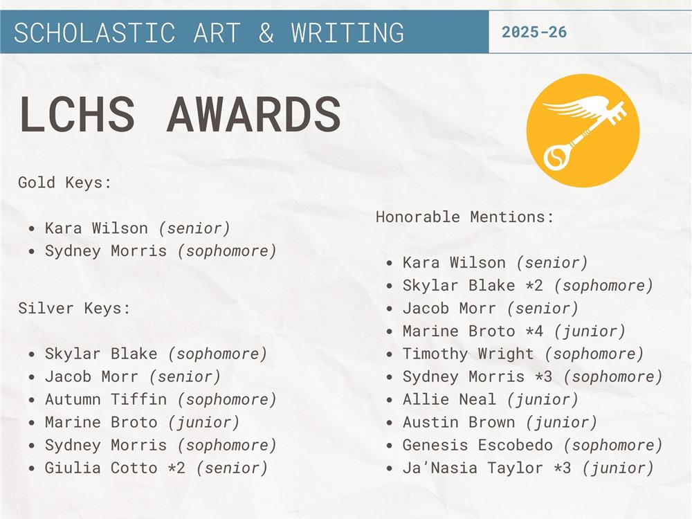 The results from the 2025-26 Scholastic Art & Writing competition are in, and the following students have been recognized for artistic excellence on a National level and are to be publicly celebrated.  Jama Wilkins and the Youth Service Center sponsored LCHS’ student entries.