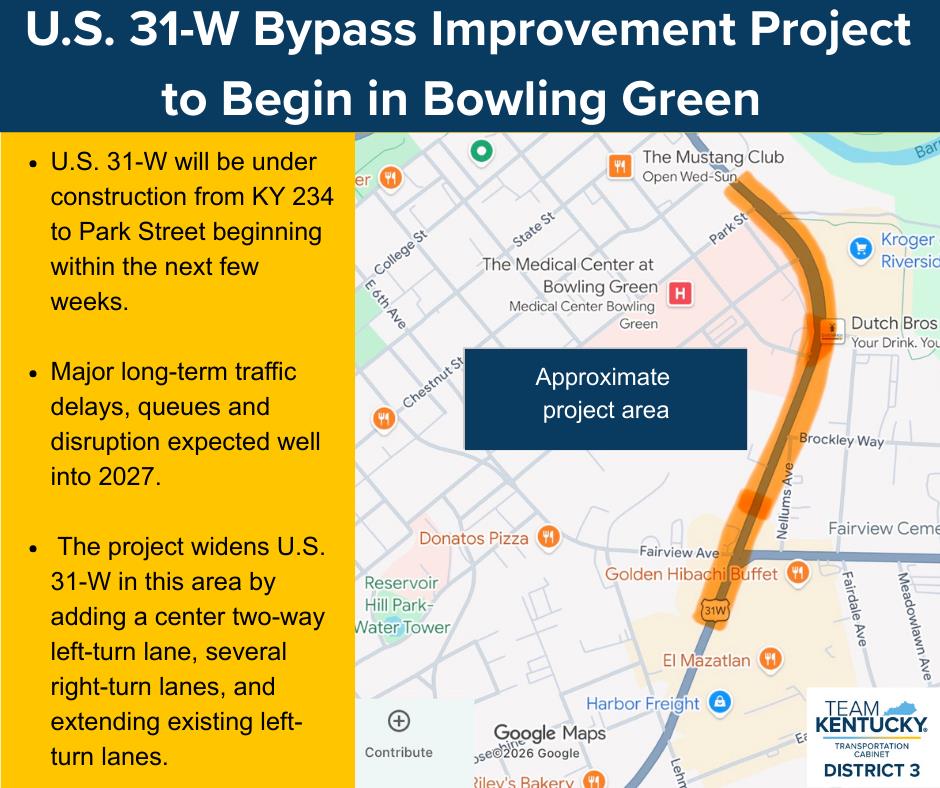 A project to improve a section of the U.S. 31-W Bypass in the northern part of Bowling Green in Warren County is expected to begin soon. This project will have major long-term traffic impacts in the area. Long-term traffic delays and traffic queues are expected during construction.