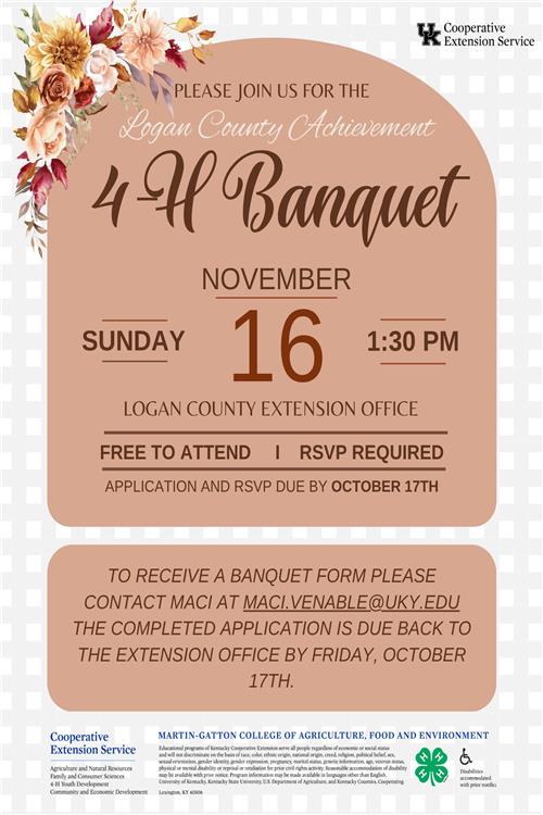 Next Friday is the deadline for Logan County 4-H Achievement Banquet RSVPs! The free banquet is not until Nov. 16, but if you do not complete the application or RSVP before Oct. 17, you can still RSVP to the banquet, but 4-Hers will not receive their customized gift. Either contact 4-H agent Maci Venable.