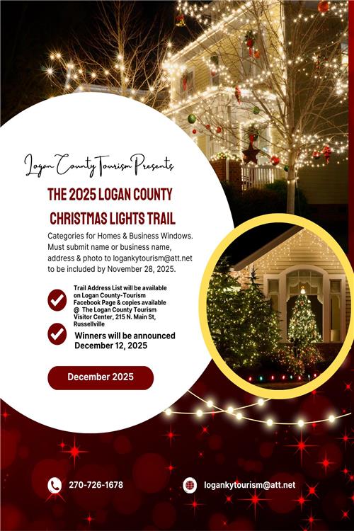 Logan County Tourism will be presenting the 2025 Logan County Christmas Lights Trail. They are inviting individuals and local businesses to decorate their homes, windows & business fronts. Please submit your photos & addresses to us at the email address shown on the graphic. They will confirm receipt of your submission. All entries are due by Nov. 28, 2025 to be included. Winners will be announced on Dec. 12. Trail Address lists will be available the month of December on their Facebook Page and at The Logan County Tourism Visitor Center, 215 N Main St, Russellville, Ky. For more information call us at 270-726-1678.