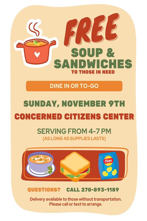 Anyone in need of food is invited to come by the Concerned Citizens Center on East Fifth Street in Russellville for a dine-in or to-go meal of soup and sandwiches tomorrow (Sunday) from 4-7 p.m. Those who need transportation or want meals delivered can call 270-893-1189. The effort from a small group who distributed soup on a street corner last weekend is led by Brooke Cowan White. The executive director of Concerned Citizens is Dorris Vick.