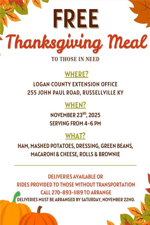 Concerned Citizens of Logan County will provide free Thanksgiving meals for those who want them on the Sunday evening before Thanksgiving. People can come to the Logan County Extension Office from 4-6 p.m. either for a sit-down meal or to pick up the food. Deliveries will also be available, but they must be arranged no later than the day before by calling 270-893-1189.