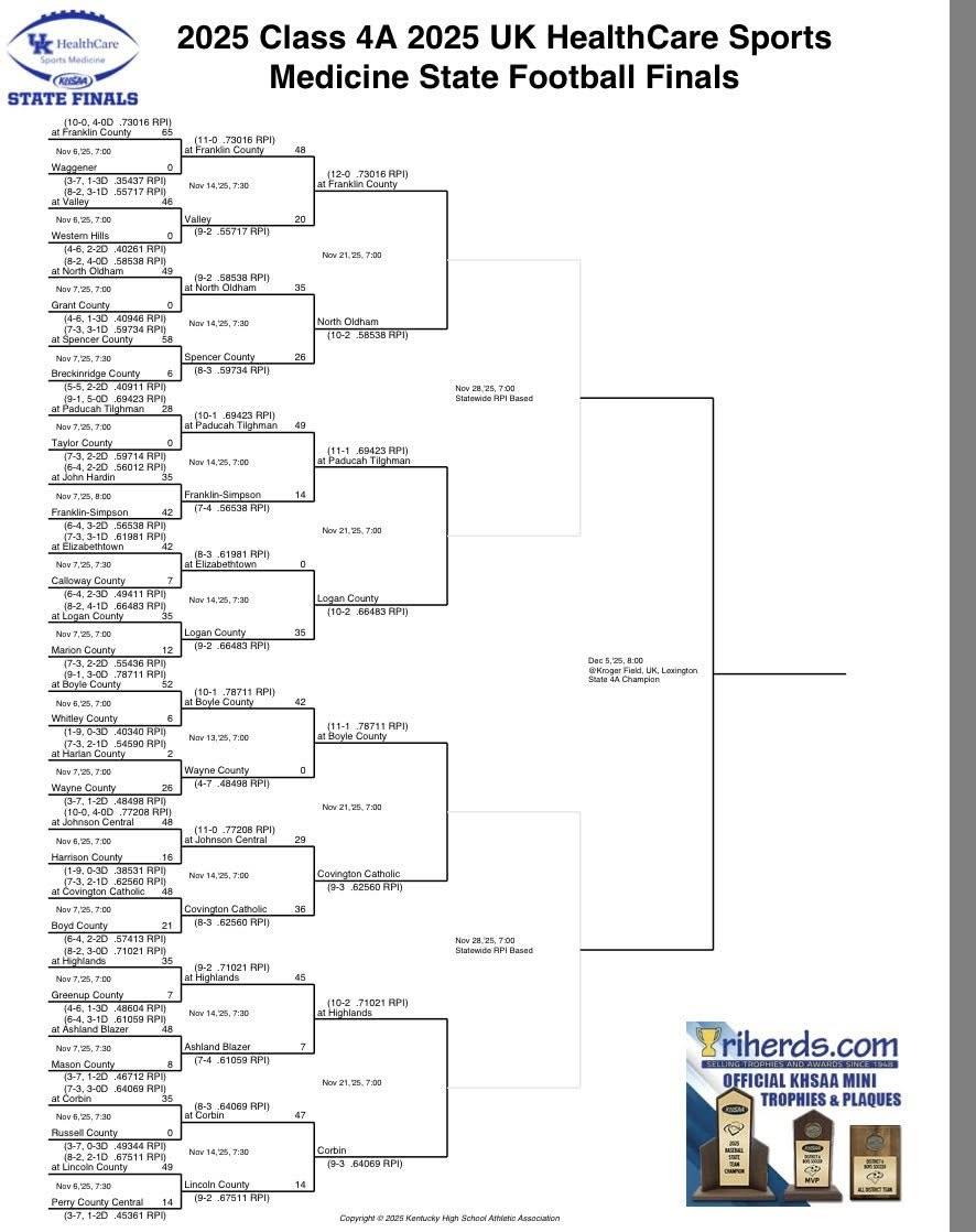 South Warren, the top-ranked team among Kentucky’s biggest high schools, won convincingly over Logan County Thursday. The Spartans won 49-14, running their record to 10-0 while Logan fell to 8-2. For the Cougars, quarterback Luke Rogers connect with Damani Goodloe for an 80-yard touchdown in the second quarter, and in the third quarter Christian Helle ran for a 65-yard score. Caiden Kirby was successful kicking both extra points, making him 20 for 20 over the last four games and 38 of 39 for the season. Coach Todd Adler’s second-seeded Cougars will entertain Marion County to start the Class 4A playoffs next Friday.