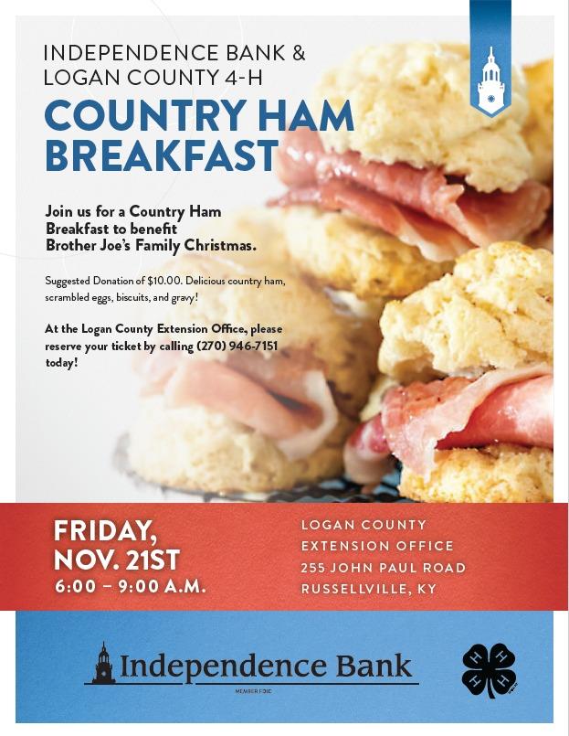 Together with Independence Bank and their community, Logan County 4-H youth are proud to lend their hands and hearts to carry on a tradition rooted in giving back. This year’s Country Ham Breakfast is this Friday, Nov. 21, from 6–9 a.m. at the Logan County Extension Office. Those eating are asked to donate $10 or more. Please call 270-946-7151 to let planners know how many will be eating. Every plate supports Agape’s Bro. Joe’s Family Christmas annual ministry—still making a difference, one biscuit at a time